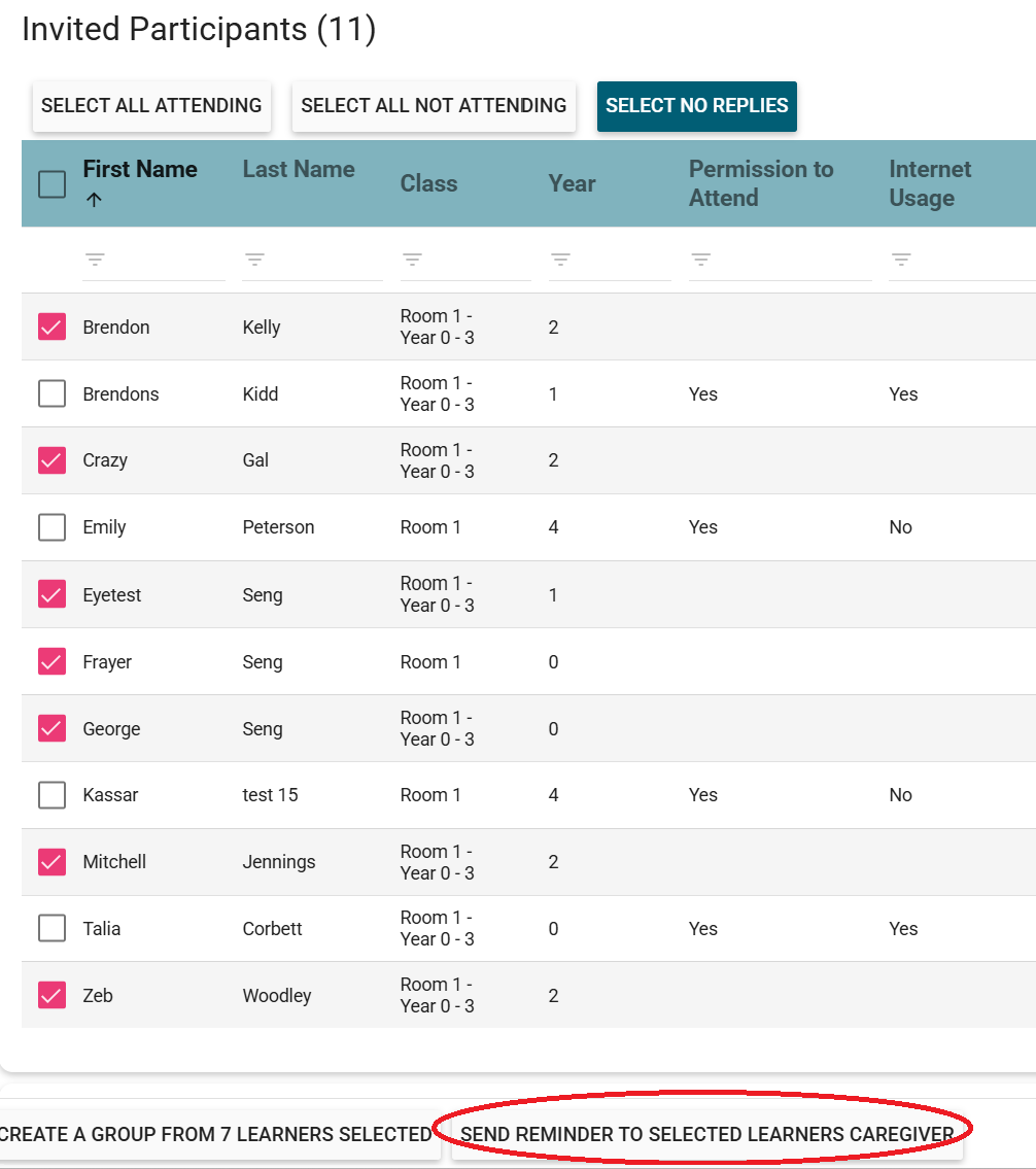 3. Click SEND REMINDER TO SELECTED LEARNERS CAREGIVER. These buttons are sticky so will remain visible as you scroll.