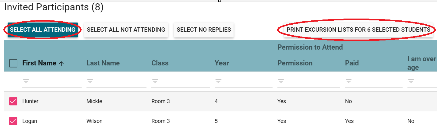 We have made it easy to produce all the lists required for your event in one go. Use the selection buttons to include the students you need. These instructions will focus on the students attending the event.