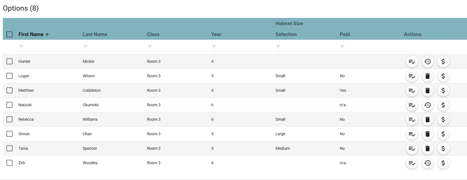 This screen will show any event or student permissions. If the event includes payment, the paid column will be displayed. If no payment is attached, this column will be omitted.