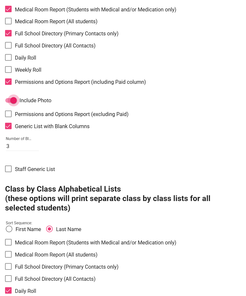 Some of the list options will allow you to include the student profile image. The Include Photo slider will appear if you select a list that this is an option for. Turn the slider ON to include student profile images