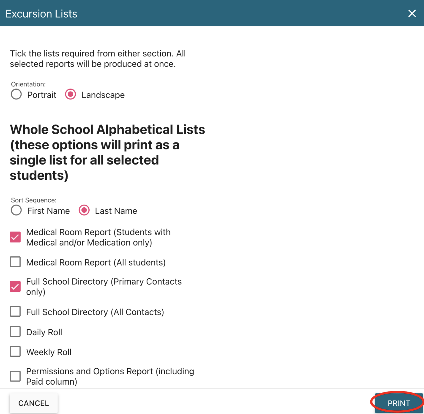 2. Click PRINT EXCURSION LISTS FOR <> SELECTED STUDENTS