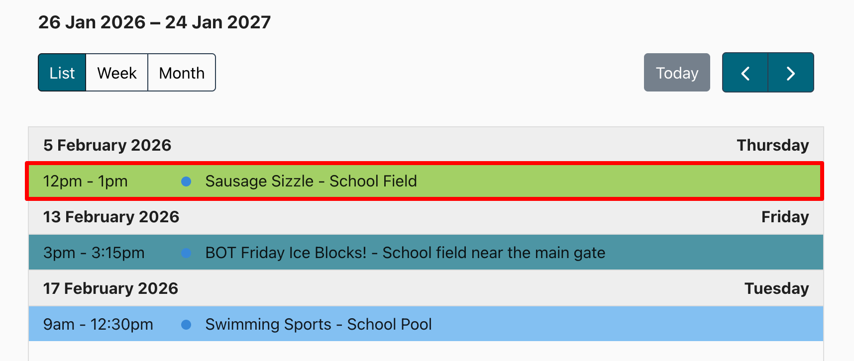 Your school events calendar is colour coded to show the status of each event: