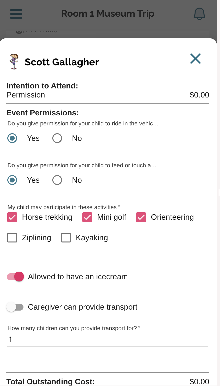 - Permissions - additional permissions relating to an event that the caregiver needs to provide approval for.