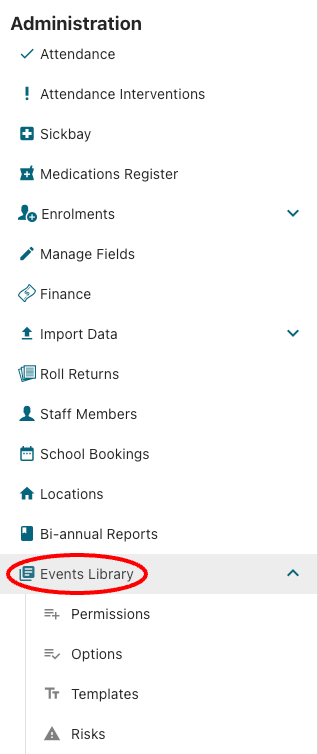 Permissions and Options created when creating a new event will populate in the Events Library. Templates and Risks must be created before using them in a new event.